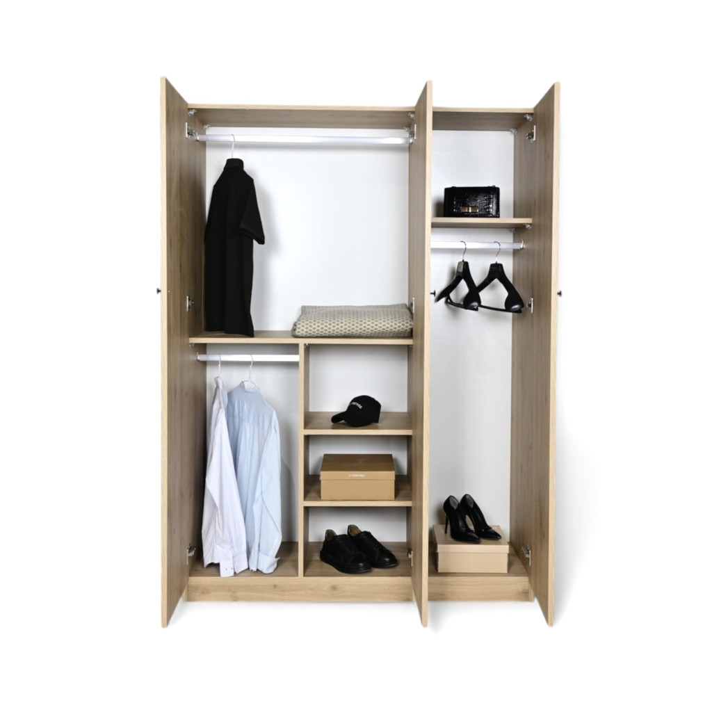 Doğal ahşap görünümü ile sıcak bir atmosfer oluşturur. Üç kapaklı tasarımı sayesinde askılık ve raf bölümleri dengeli şekilde konumlandırılmıştır. Orta ve büyük ölçekli yatak odaları için idealdir.