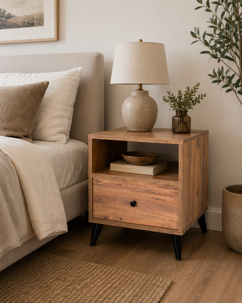 Modern ayak yapısı ve çekmeceli tasarımı ile hem estetik hem fonksiyonel bir kullanım sunar. Üst açık raf alanı sayesinde pratik depolama imkânı sağlar.