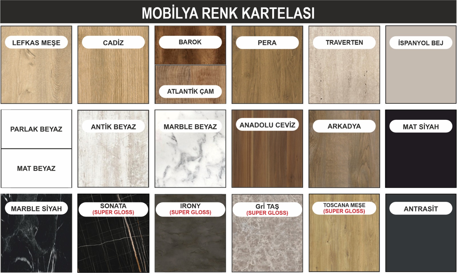 Atlantik Çam Barok Pera Lefkas Meşe Marble Beyaz Marble Siyah Parlak Beyaz Mat Beyaz Anadolu Ceviz Arkadya Antik Beyaz Antrasit Cadiz Mat Siyah Mat Irony Traverten İspanyol Bej Mat Sonata Mat Gri Taş Parlak Sonata Parlak Gri Taş Parlak Irony Toscana Meşe