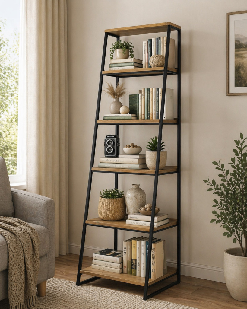 Dar alanlar için tasarlanmış kompakt yapısı ile fonksiyonel bir çözümdür. Çoklu raf sistemi kitap ve dekor ürünleri için düzenli kullanım sağlar. Metal çerçeve yapısı modern bir stil sunar.