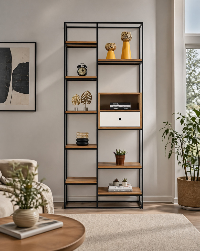 Geometrik metal tasarımı ile dikkat çekici bir dekoratif üründür. Farklı seviyelerde yerleştirilen rafları sayesinde bitki ve aksesuarlar için estetik bir sergileme alanı sunar. Modern ve endüstriyel mekanlar için idealdir.