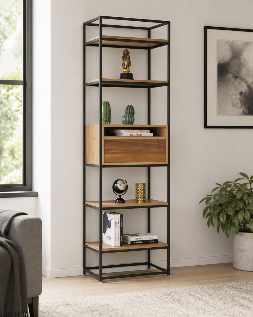 Metal çerçeve tasarımı ve tek çekmeceli modülü ile hem dekoratif hem fonksiyonel bir kullanım sunar. Açık raf sistemi sayesinde kitap ve aksesuarlar için şık bir sergileme alanı oluşturur. Modern ve endüstriyel dekorasyon stilleriyle uyumludur.