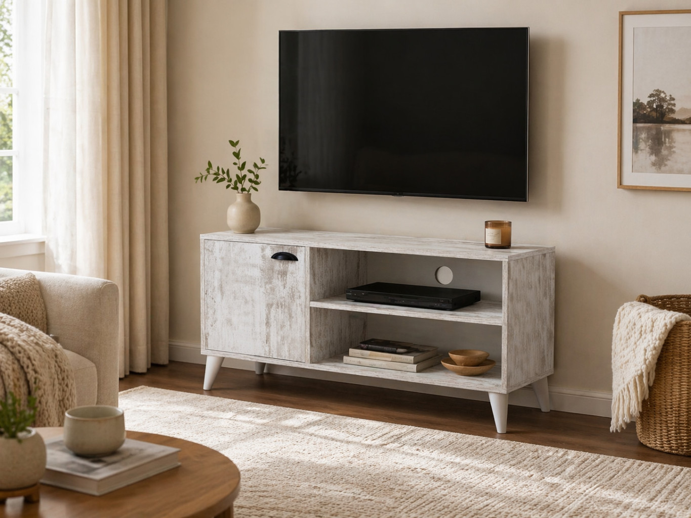 Modern ayak yapısı ve dengeli tasarımı ile şık bir görünüm sunar. Kapaklı bölmeler ve açık raf sistemi sayesinde düzenli depolama alanı sağlar.