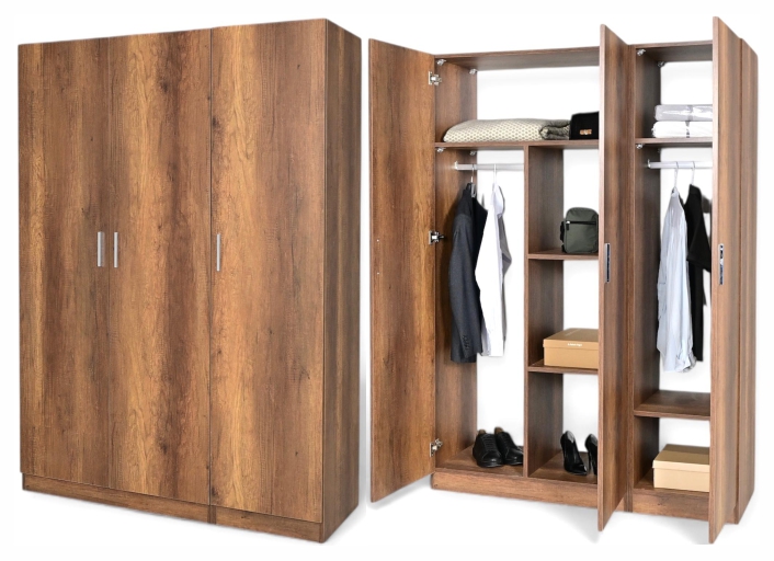 Doğal ahşap görünümü ile sıcak bir atmosfer oluşturur. Üç kapaklı tasarımı sayesinde askılık ve raf bölümleri dengeli şekilde konumlandırılmıştır. Orta ve büyük ölçekli yatak odaları için idealdir.