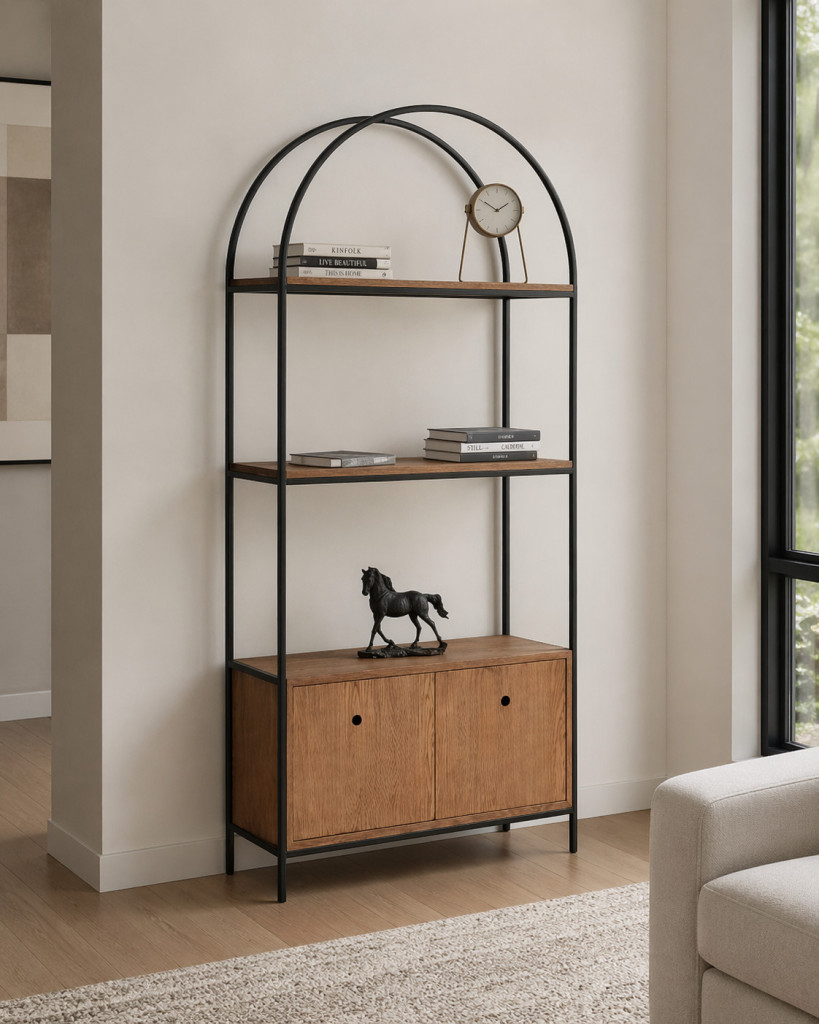 Üst bölümde açık raf sistemi, alt bölümde kapaklı depolama alanı bulunan fonksiyonel bir modeldir. Kavisli metal çerçevesi ile şık ve modern bir görünüm sunar. Hem dekoratif hem düzenleyici kullanım için idealdir.