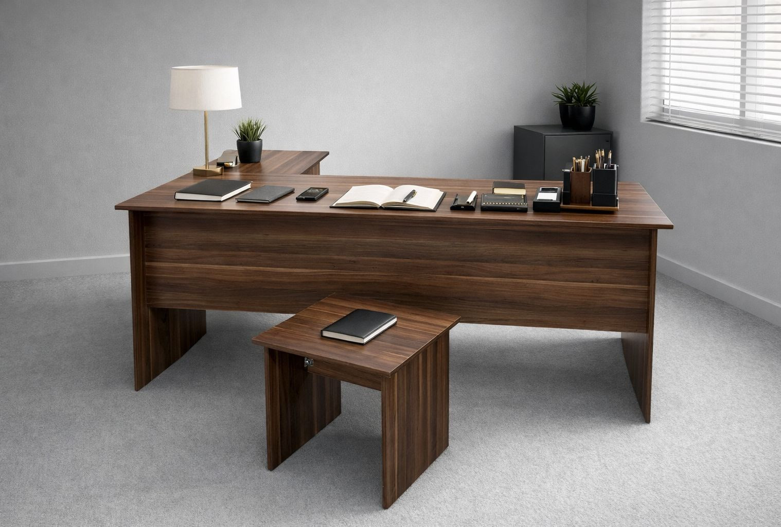 Şık ve fonksiyonel tasarımıyla ofislerinize prestij katan bu yönetici masa takımı, hem estetik hem kullanım kolaylığı sunar. Geniş çalışma alanı sayesinde bilgisayar, evrak ve aksesuarlarınızı rahatça konumlandırabilirsiniz. Üst platform bölümü yazıcı ve düzenleyiciler için ekstra alan sağlarken, sağlam gövde yapısı uzun ömürlü kullanım sunar.