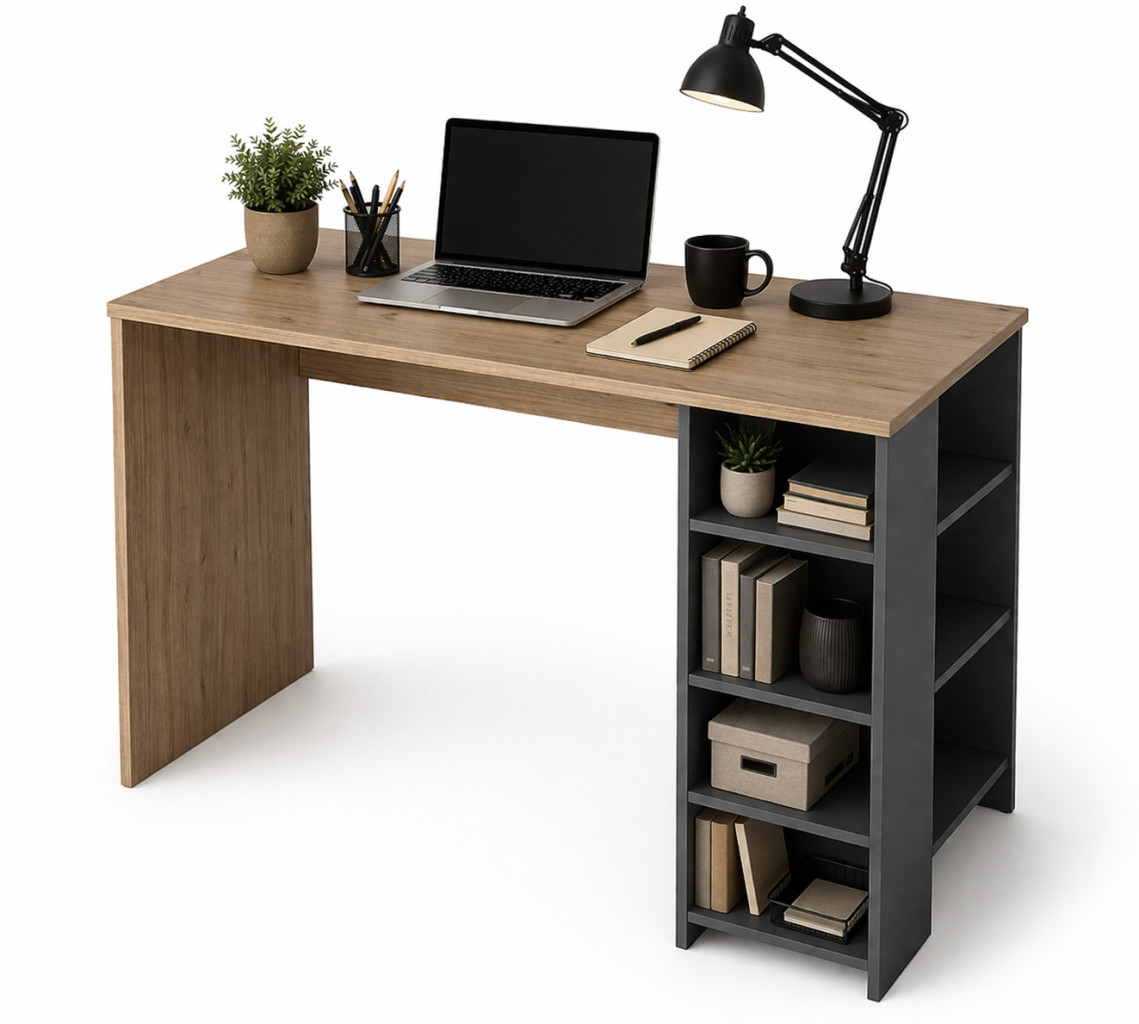 Modern ve fonksiyonel tasarımıyla genç odaları için ideal bir modeldir. Yan bölümde yer alan açık raf sistemi sayesinde kitap ve aksesuarlar için pratik depolama alanı sunar. Geniş tabla yapısı konforlu bir çalışma alanı sağlar.