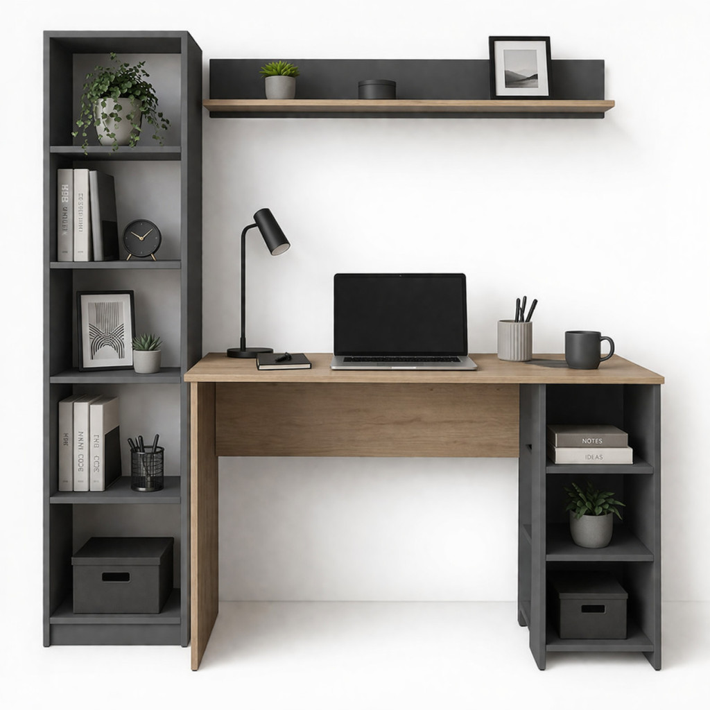 Masa, yan kitaplık ve üst raf modülünden oluşan set tasarımı sayesinde bütüncül bir çalışma alanı oluşturur. Açık raf bölümleri kitap ve aksesuar düzeni için idealdir. Modern çizgileri ile genç odalarına dinamizm katar.